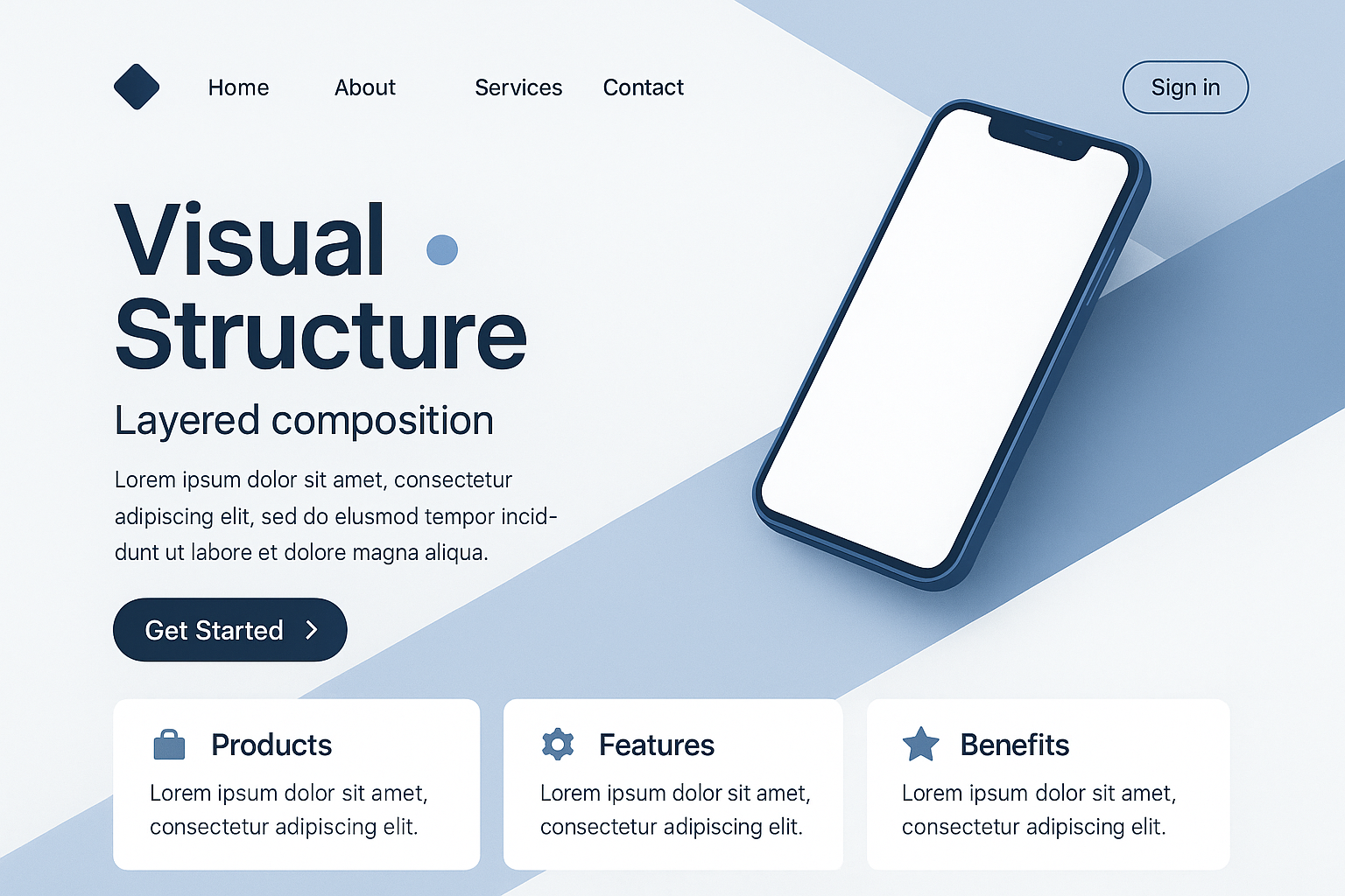 /Collection: /by davooda/Type: PNG/A visually appealing landing page design featuring a blue phone, geometric shapes, and a clean layout. Includes sections for products, features, and benefits with a clear call to action.