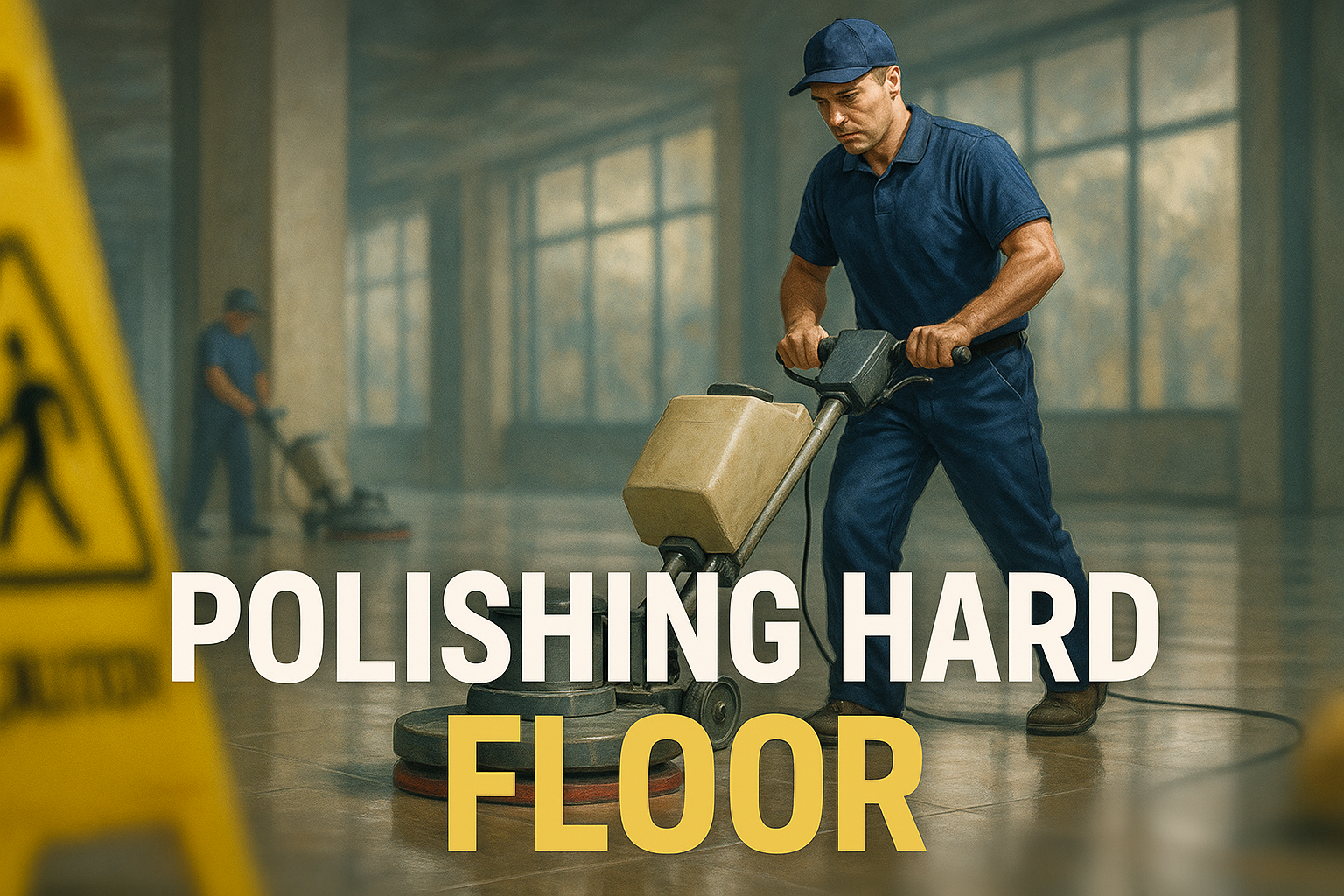 Dynamic image of a worker polishing a hard floor with a machine, showcasing a professional cleaning service. Ideal for promotional materials in cleaning industry.