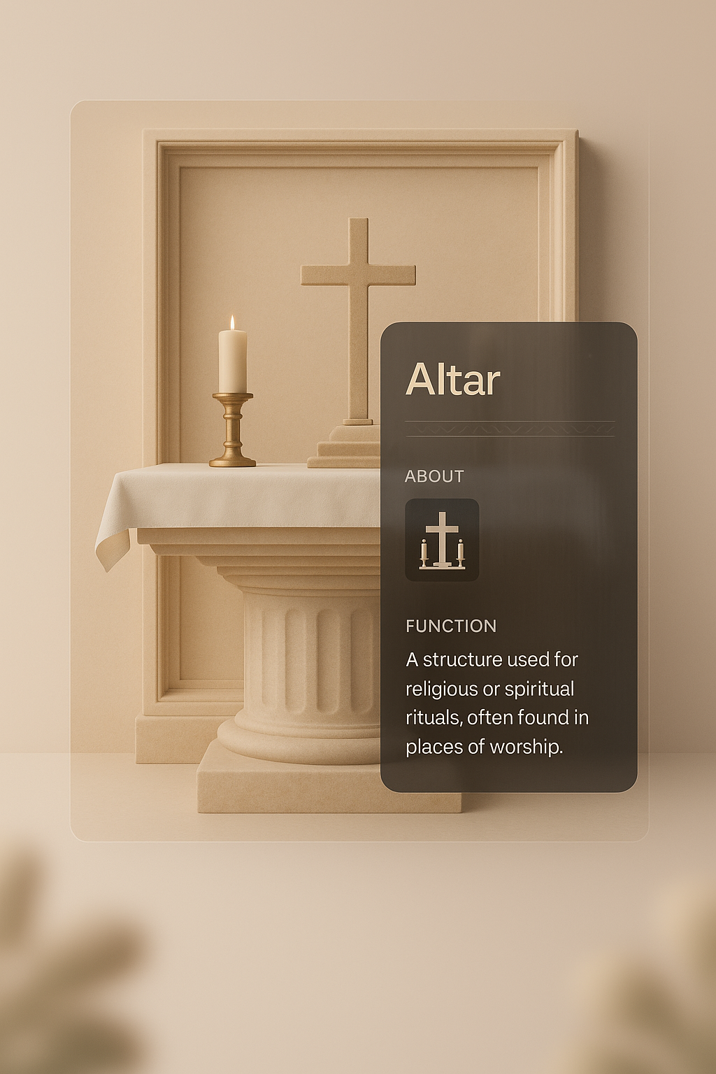 A beautifully designed 3D altar featuring a candle and a cross, with an informative overlay detailing its function. The light tones and smooth gradients enhance the serene atmosphere.