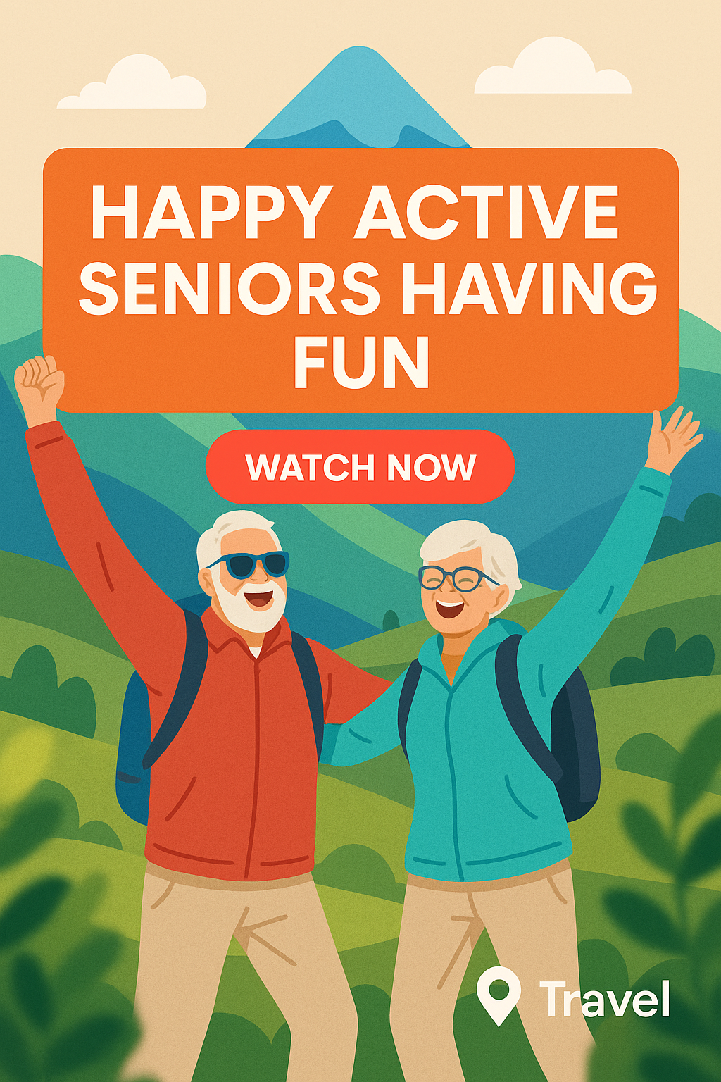Colorful social media post highlighting happy, active seniors enjoying outdoor activities, designed to attract viewers to travel content with a cheerful and inviting visual style.