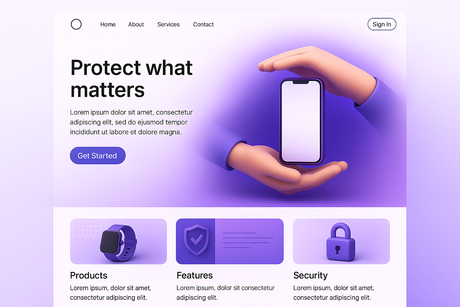A modern landing page showcasing a 3D illustration of a phone held protectively between two hands. The layout includes sections for products, features, and security.