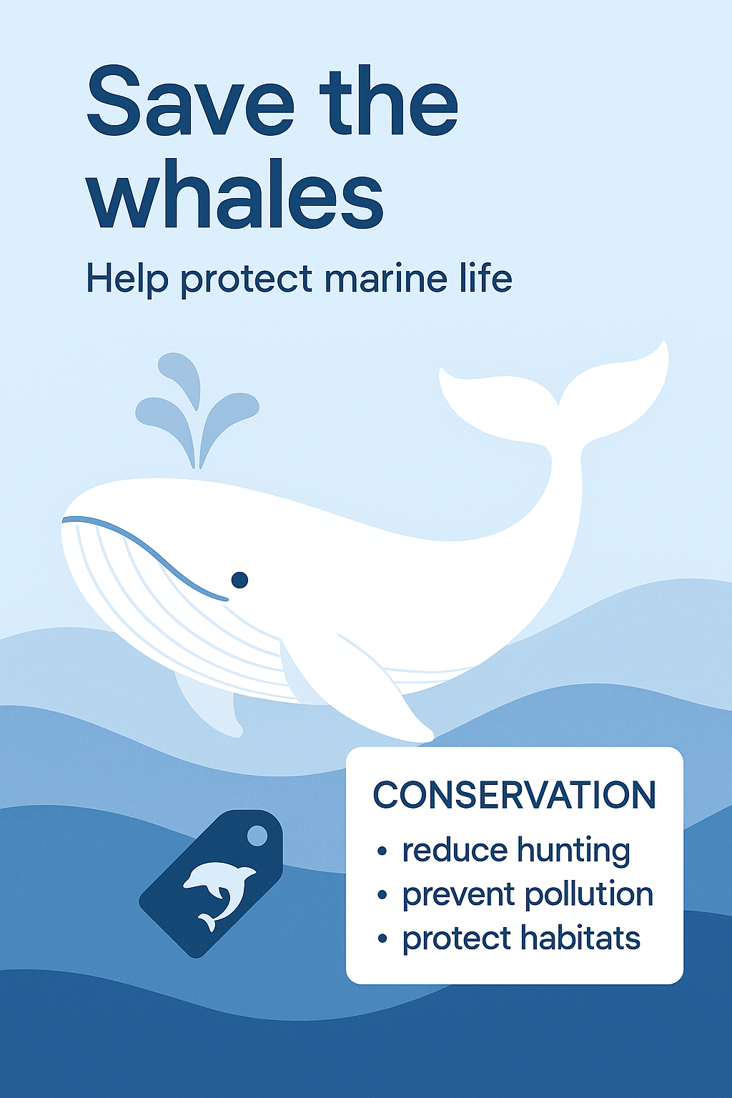 /Collection: /by davooda/Type: PNG/A visually appealing graphic promoting whale conservation with a whimsical whale illustration, designed to raise awareness about protecting marine life. Ideal for educational and environmental campaigns.