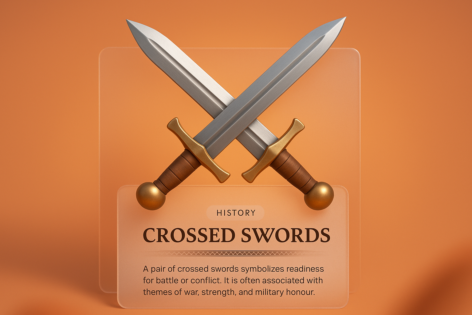A striking 3D illustration of crossed swords on a smooth gradient background. The design features a text block with a title and description, emphasizing themes of war and honor.