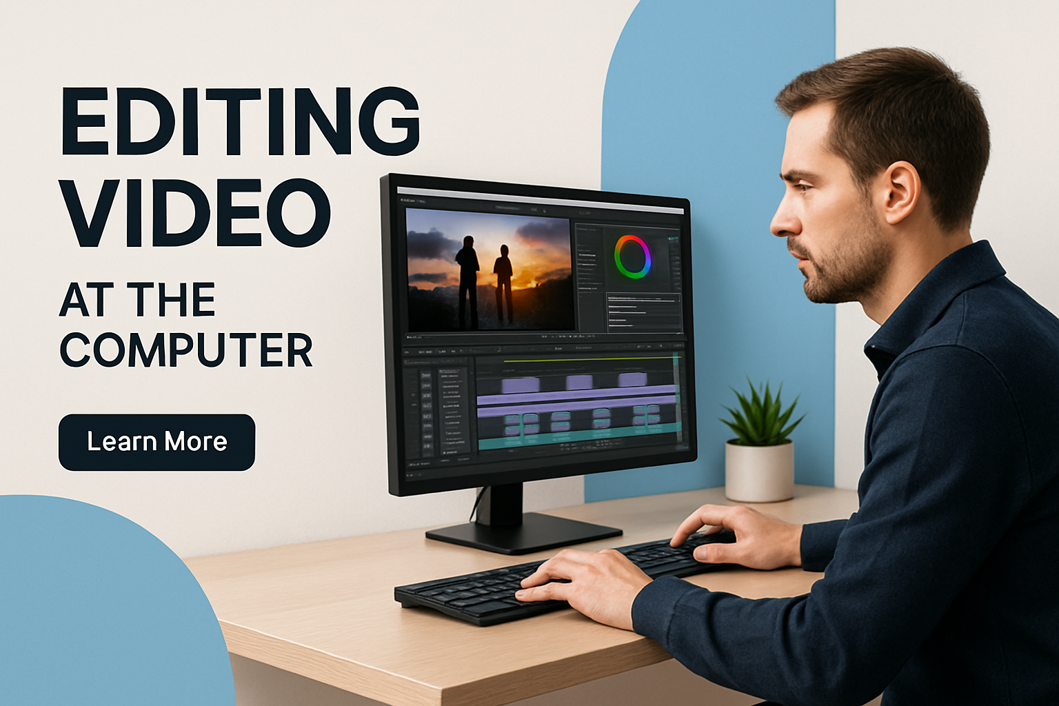 /Collection: /by davooda/Type: PNG/A professional video editing interface featuring a well-lit editor at a computer. The layout includes bold typography and a call-to-action button, set against a bright geometric background.