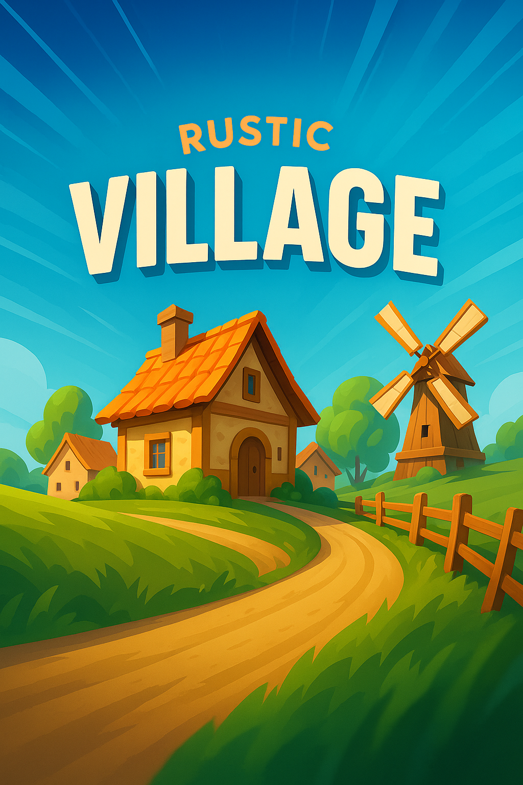 Dynamic Village Scene with Vibrant Elements and Bold Typography