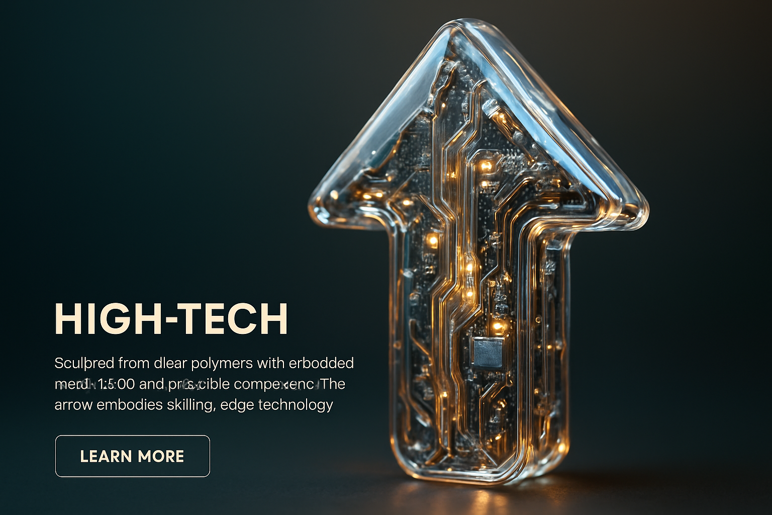 /Collection: /by davooda/Type: PNG/A hyperrealistic 3D arrow, crafted from clear polymers, showcases glowing micro-LEDs and intricate circuit boards. The composition emphasizes its sleek design and high-tech features against a soft gradient background.