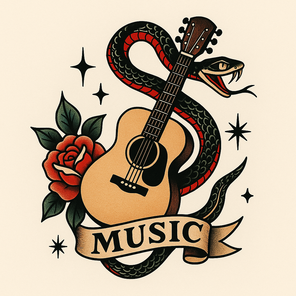 Stylized tattoo-inspired graphic displaying an acoustic guitar entwined with a snake and adorned with a rose, perfect for music lovers and tattoo enthusiasts.