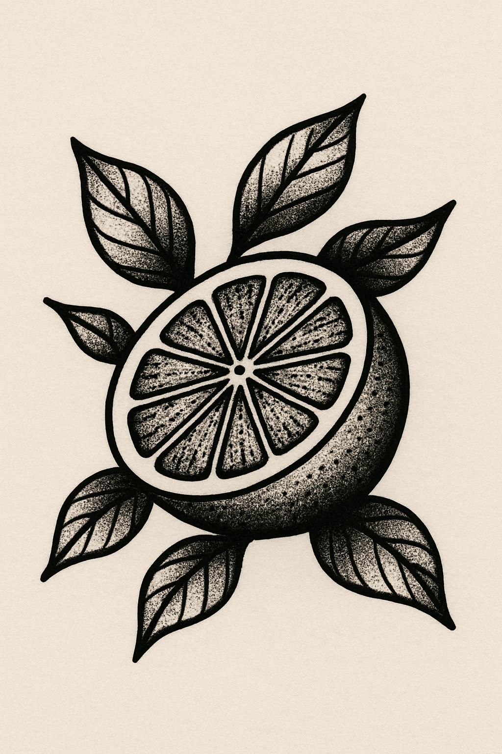 /Collection: /by davooda/Type: PNG/This image features a detailed black and white illustration of a lemon with leaves, ideal for artistic projects or branding. Its minimalist design appeals to a wide audience.
