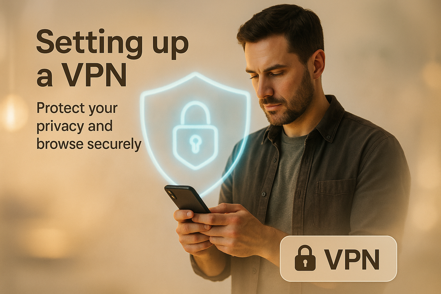 /Collection: /by davooda/Type: PNG/Informative graphic depicting a man setting up a VPN on his phone, emphasizing digital privacy with a modern design. Ideal for tech blogs or online security guides.