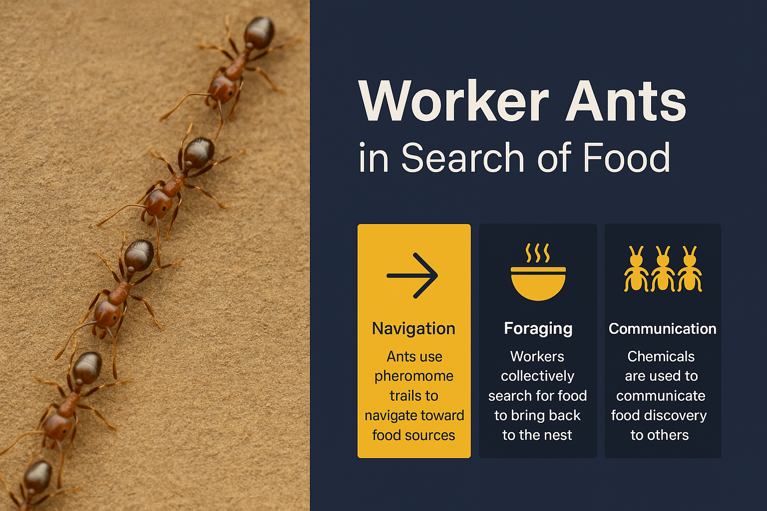 Educational infographic detailing the behavior of worker ants in search of food, featuring clear sections on navigation, foraging, and communication.