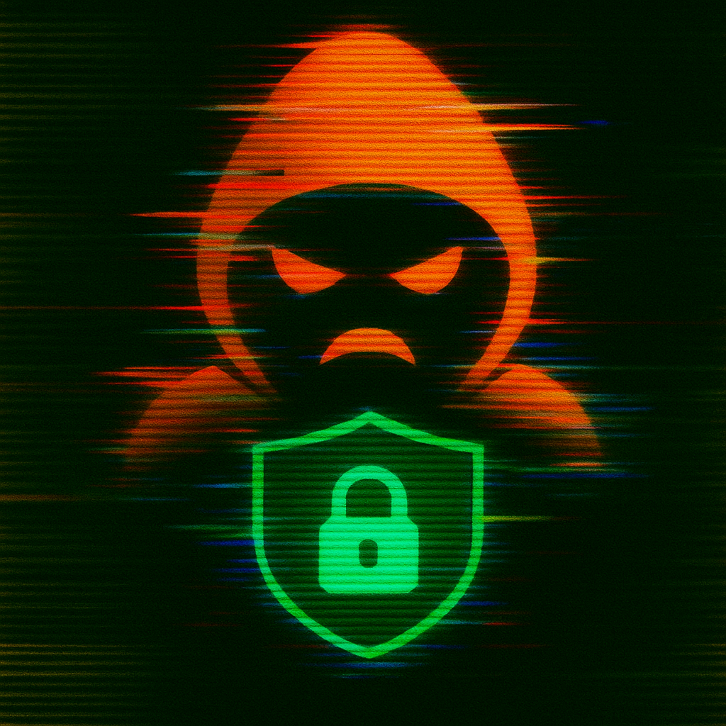/Collection: /by davooda/Type: PNG/A visually striking graphic illustrating a hacker figure with an angry expression, set against a dark background. The image incorporates a shield symbolizing security, designed for cybersecurity awareness and digital safety campaigns.