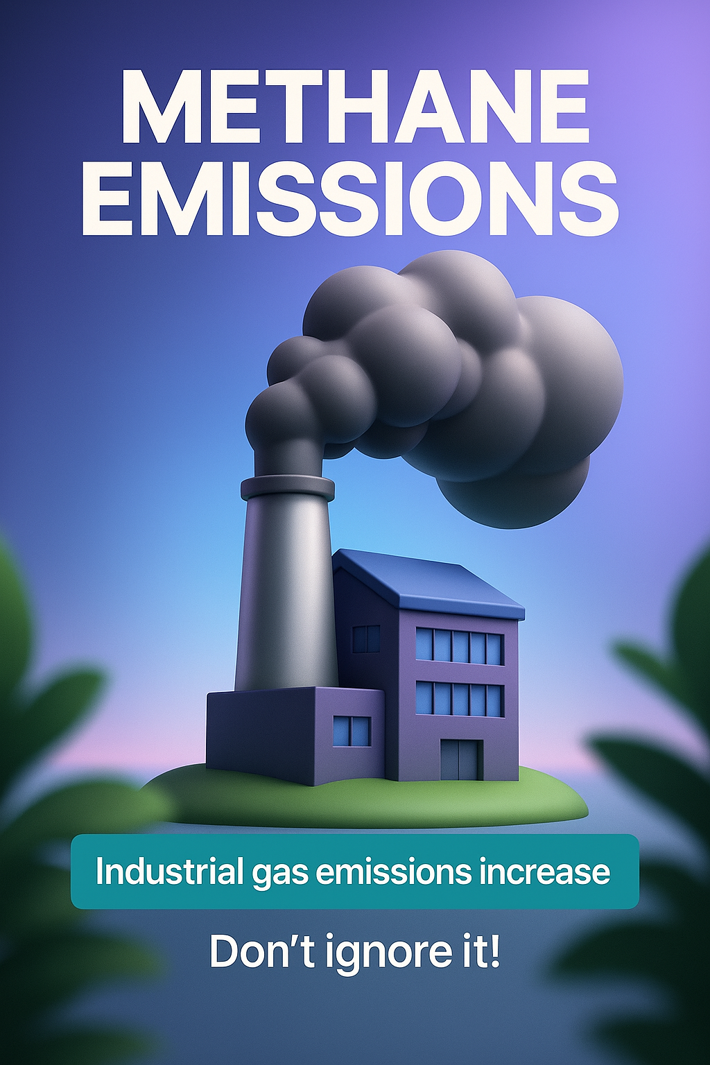 A vibrant 3D illustration depicting a factory emitting smoke, symbolizing methane emissions. The background features a smooth gradient, enhancing the visual focus.
