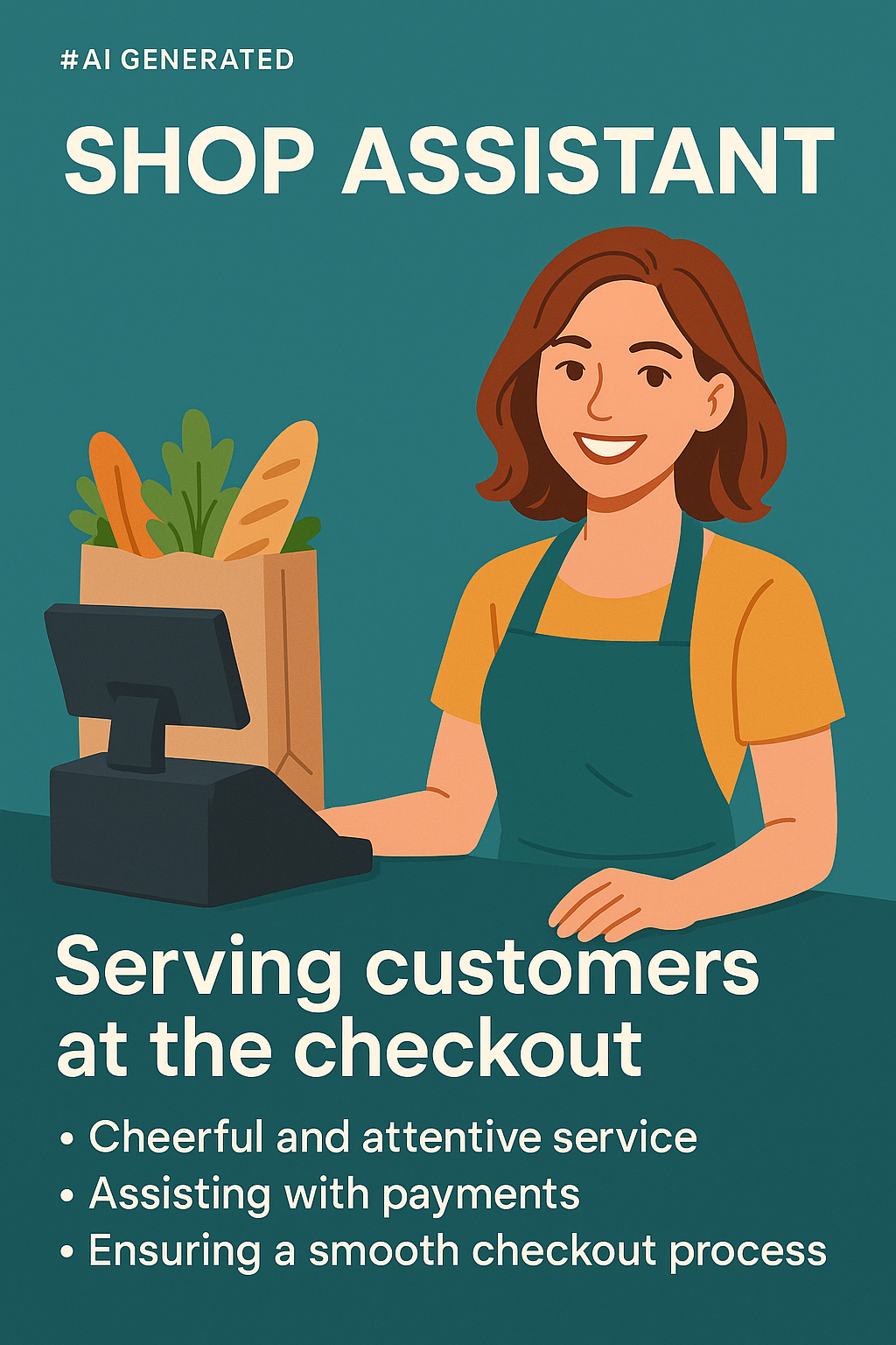 Colorful illustration of a shop assistant at a checkout counter, showcasing customer service skills. Ideal for retail or service industry promotions.