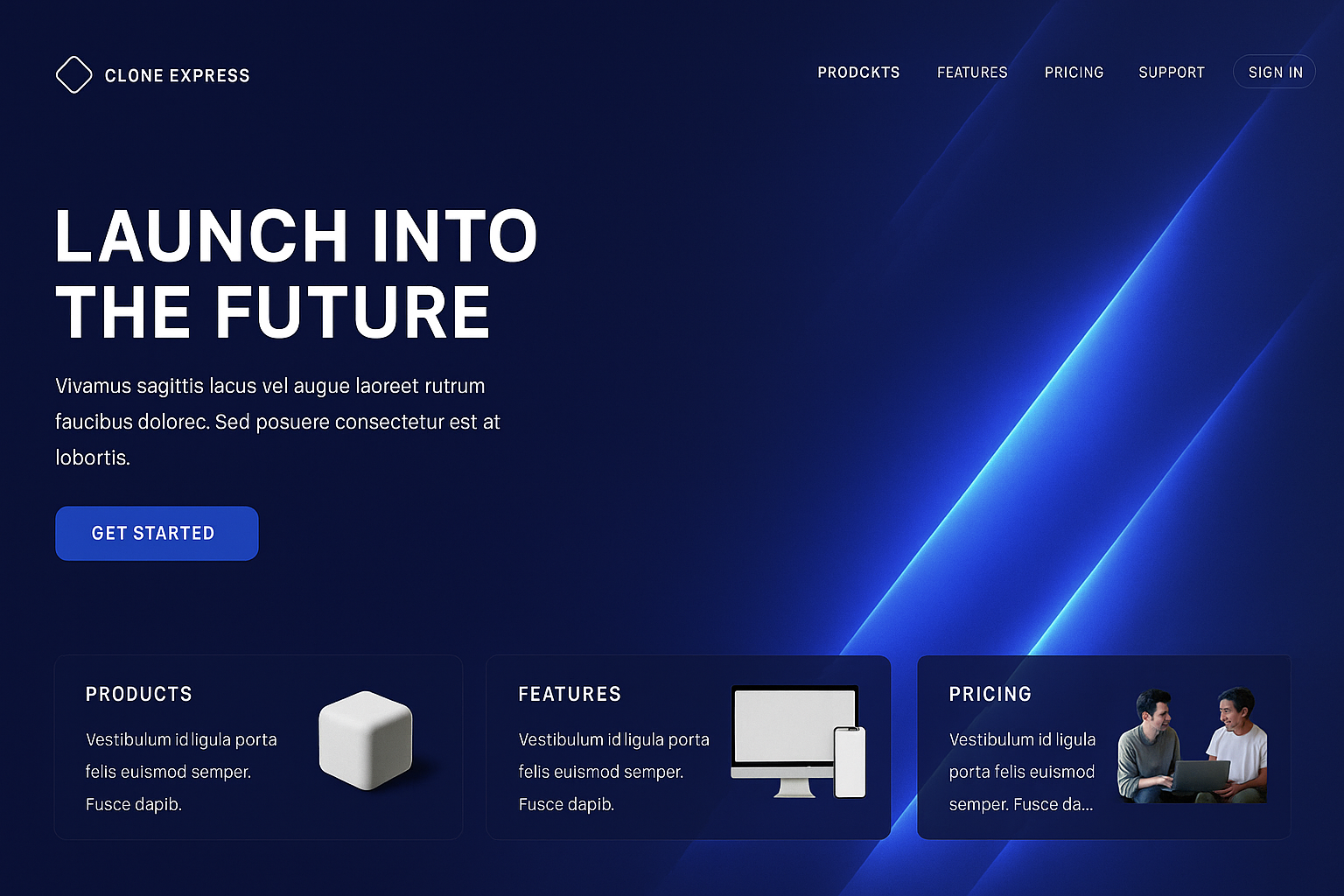/Collection: /by davooda/Type: PNG/A modern landing page design featuring a blue abstract background with elegant diagonal lines. It includes sections for products, features, and pricing, with a cinematic and energetic atmosphere.