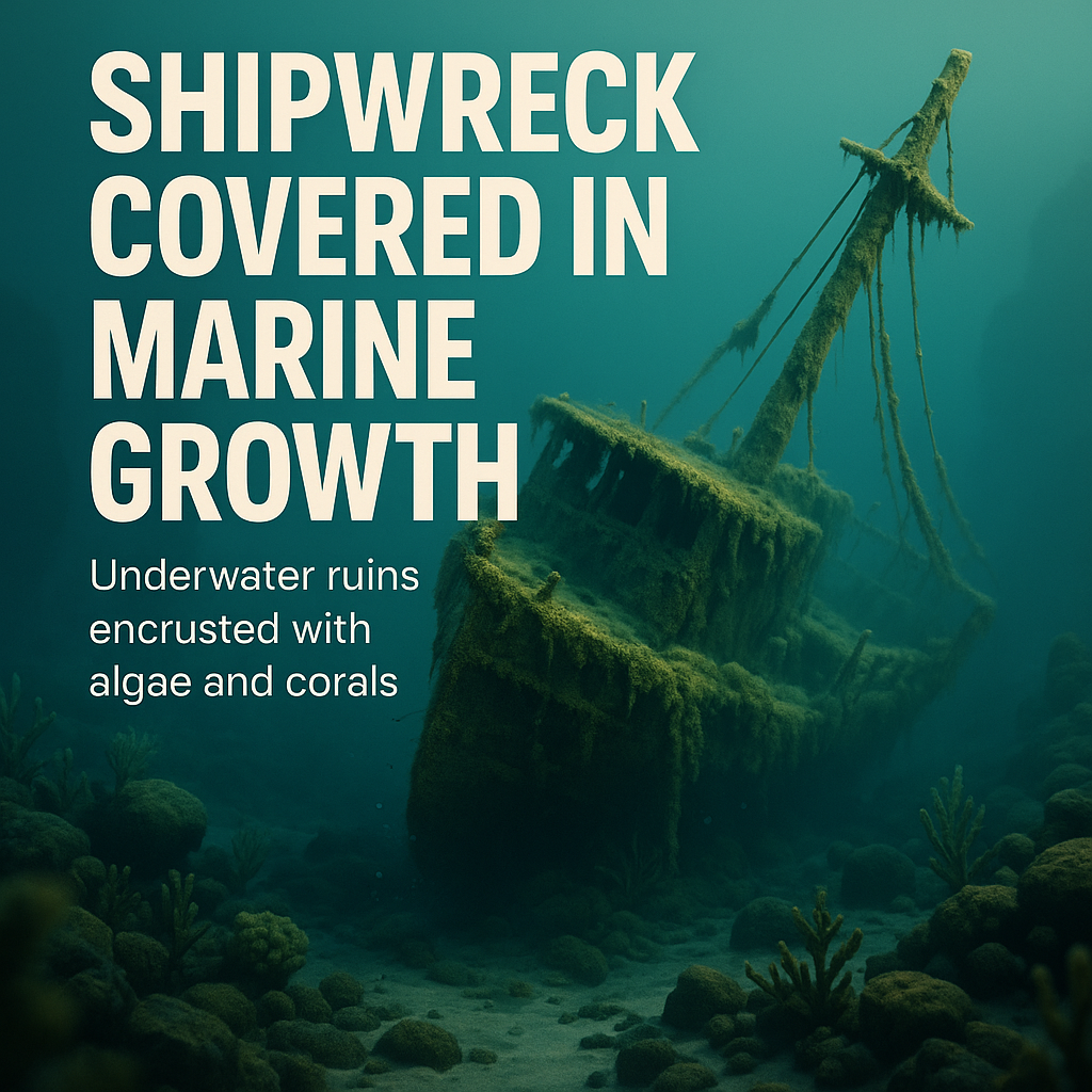 An underwater scene depicting a shipwreck covered in marine growth, including algae and corals. The image showcases the beauty of submerged ruins in a serene ocean environment.