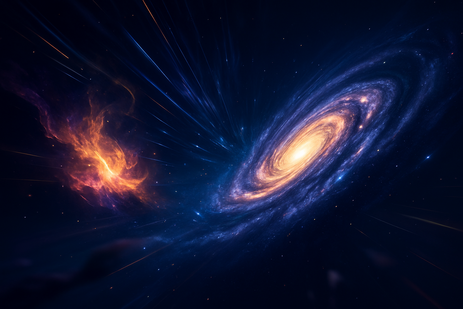 A stunning depiction of a vibrant galaxy surrounded by a colorful nebula, showcasing dynamic lines radiating from the center. The composition emphasizes depth and motion.