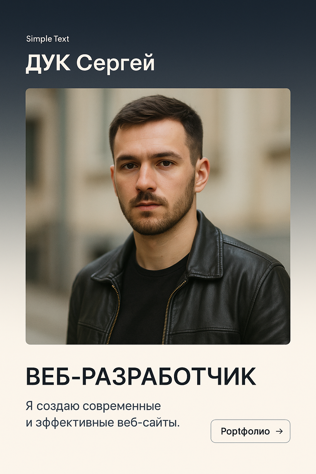 A realistic web design showcasing a male web developer with a background gradient. Includes a small label, title, text block, and action button, all in a cohesive layout.