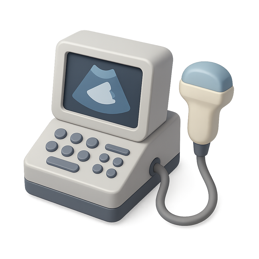 A stylized 3D icon of an ultrasound machine featuring a monitor and probe, designed with a three-quarter view and a soft, isometric look. The machine is presented on a transparent background.