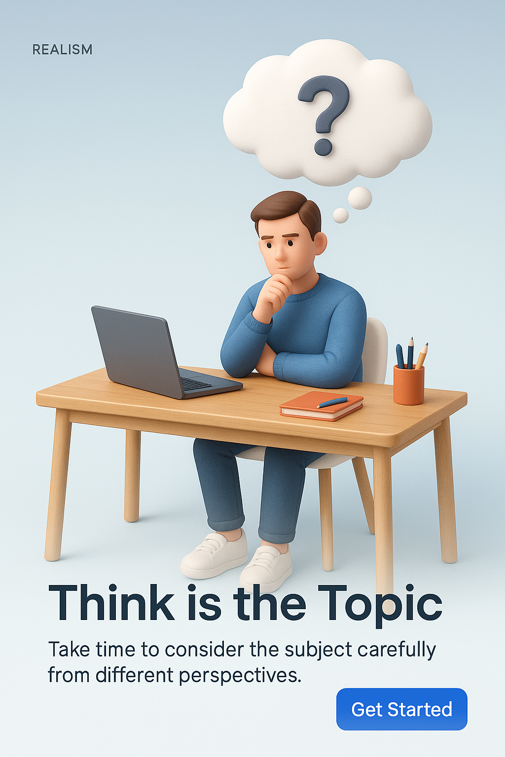 /Collection: /by davooda/Type: PNG/A realistic 3D illustration featuring a character pondering over a laptop, set against a smooth gradient background. The image includes a thought bubble and text elements for clarity.