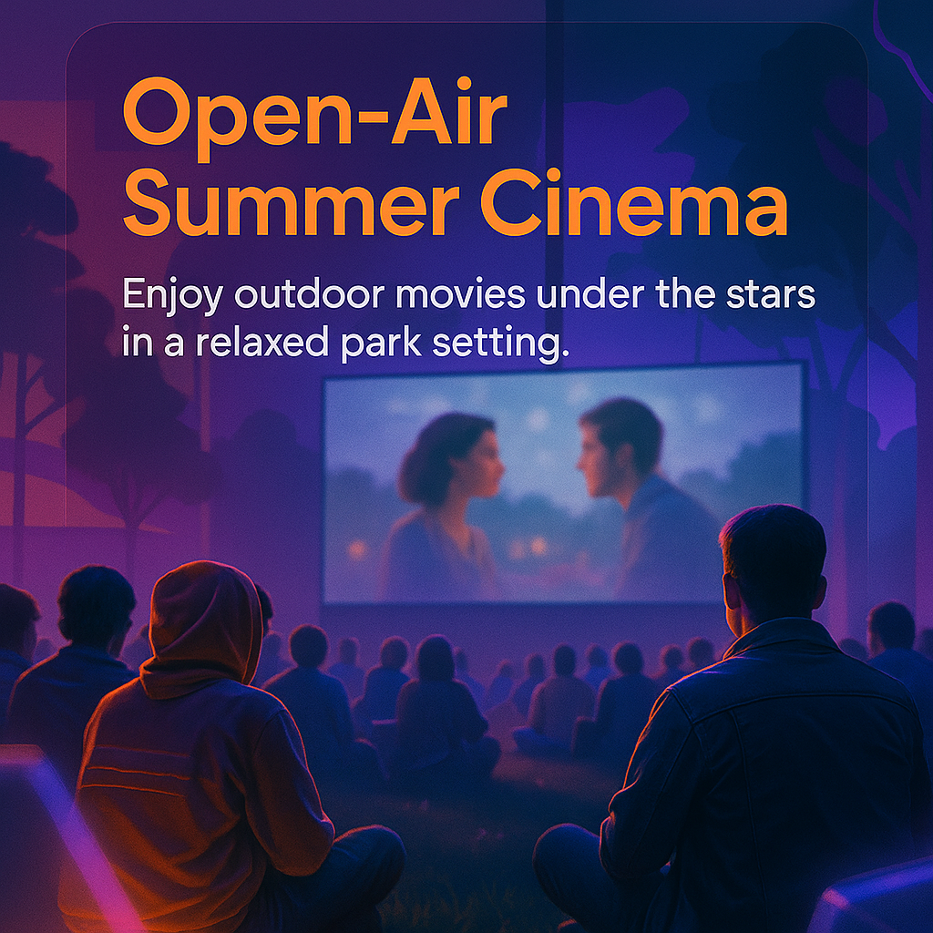 Vibrant promotional graphic for an outdoor summer cinema event, showcasing a movie screen in a park setting with an audience. Ideal for event marketing and social media promotion.