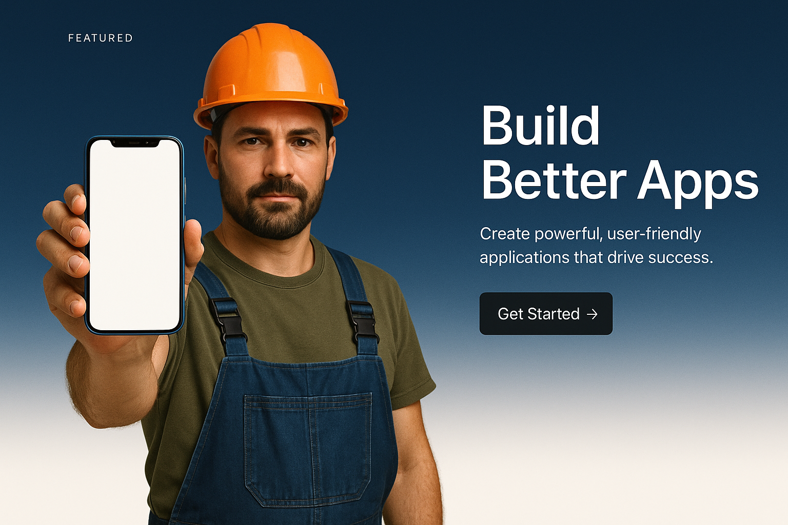 /Collection: /by davooda/Type: PNG/A construction worker in an orange helmet presents a smartphone against a gradient background. The image conveys a blend of professionalism and modern technology.