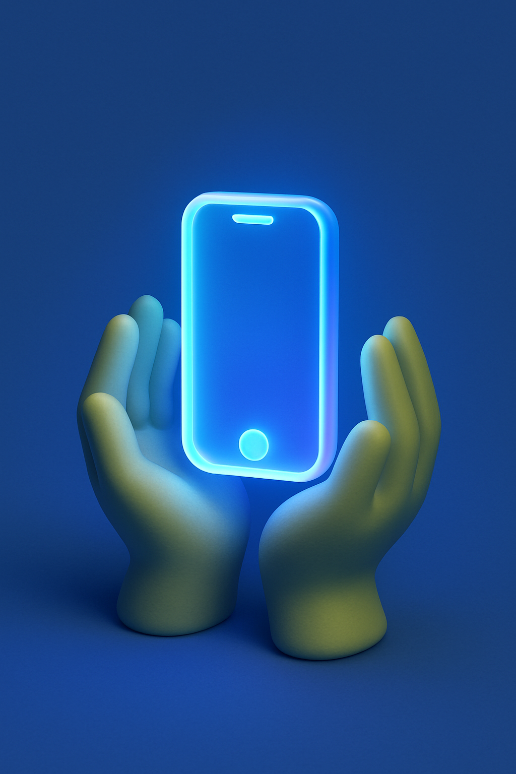 A stylized ultra-realistic 3D representation of a glowing phone icon held by two hands. The icon emits a soft blue light, creating a serene atmosphere against a light blue background.