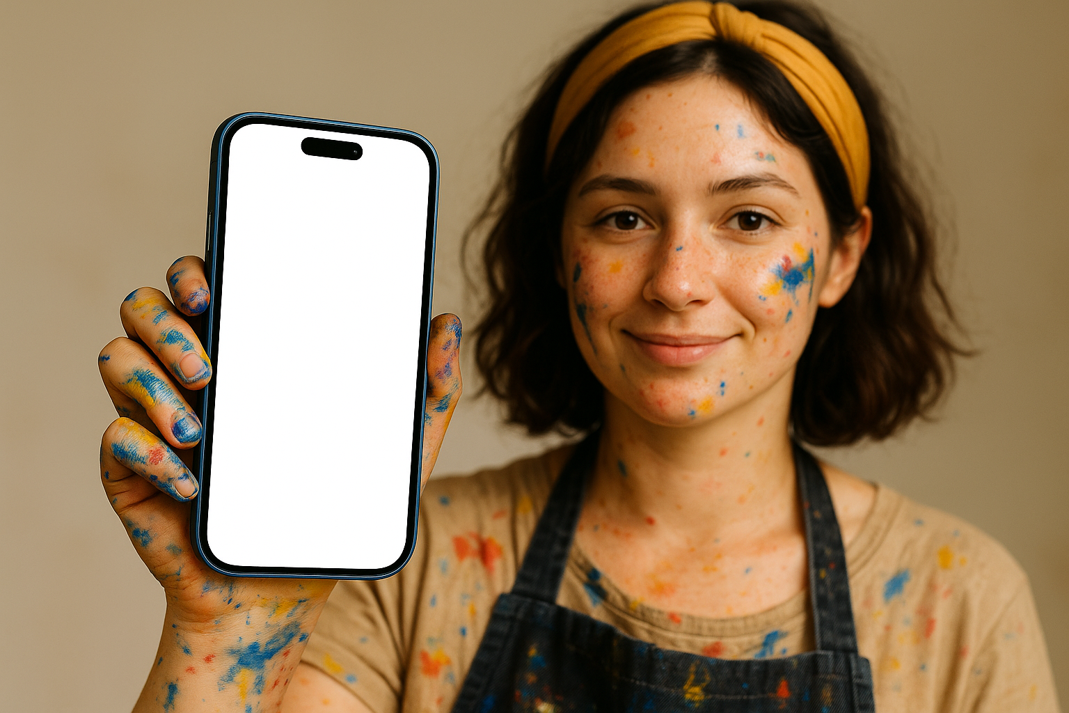 A woman artist with paint on her hands proudly holds a phone displaying a blank screen. Her colorful hands and cheerful expression highlight her artistic spirit.
