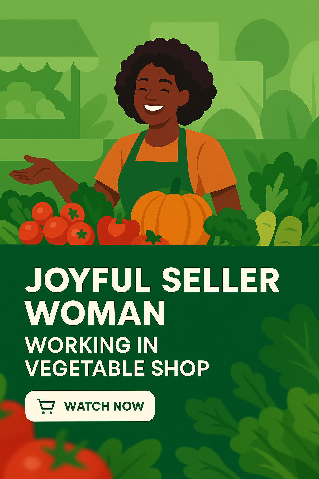 /Collection: /by davooda/Type: PNG/Vibrant illustration of a joyful woman selling vegetables in a market, featuring a green color palette and a friendly atmosphere, ideal for promotional or educational content about healthy eating.