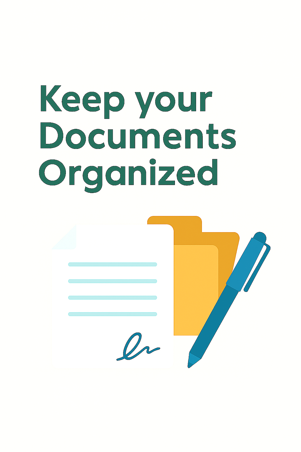 A minimalist graphic encouraging document organization featuring simple illustrations of a folder and a pen, ideal for office or productivity-themed content.