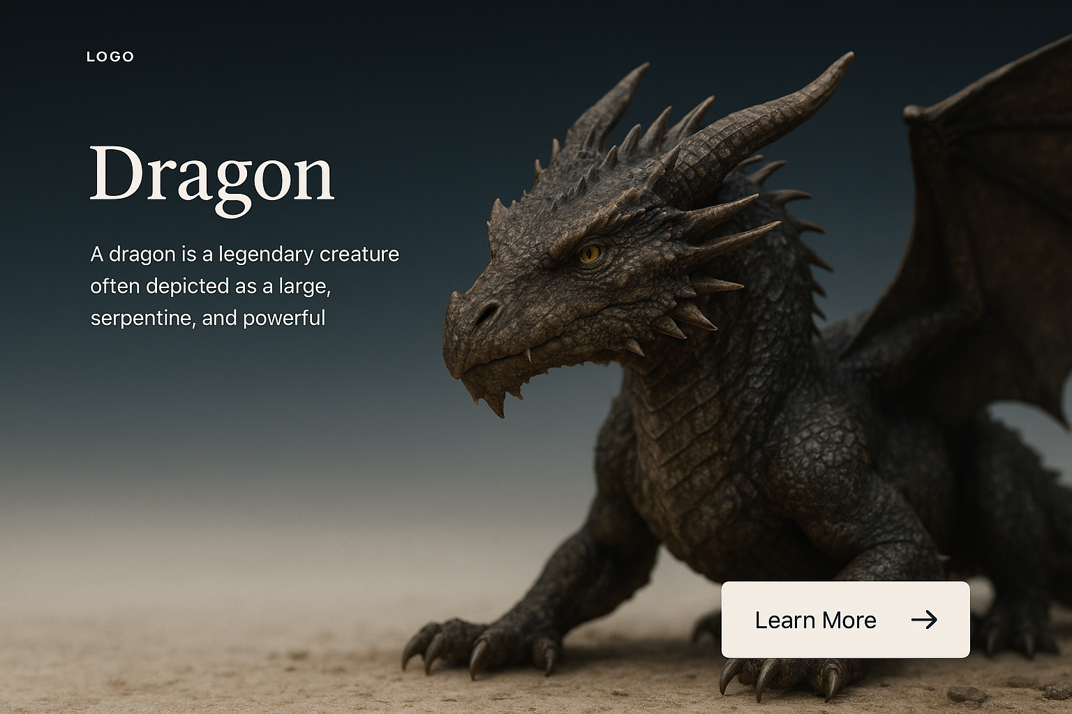 A realistic dragon illustration set against a gradient background, featuring a logo, title, text block, and action button, designed for web page use.