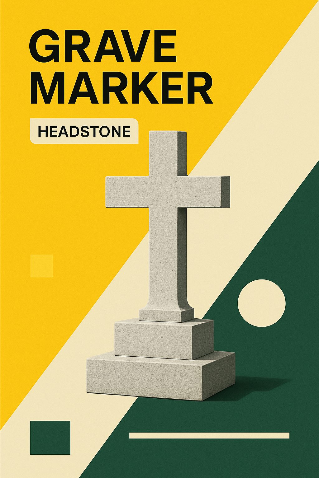 A modern and energetic visual of a grave marker, featuring a cross in a minimalist style. The composition includes distinct color blocks and a clean aesthetic.