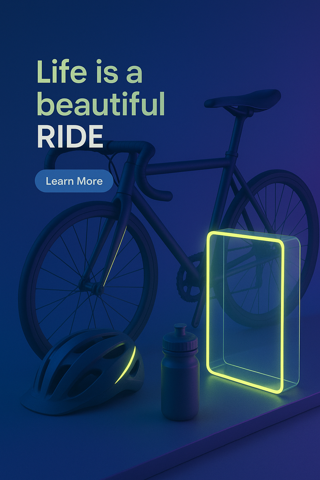 /Collection: /by davooda/Type: PNG/A visually striking cycling scene featuring a bike, helmet, and water bottle, all highlighted by glowing neon elements. The composition uses cool shades of blue and violet, creating a shadowy yet vibrant atmosphere.
