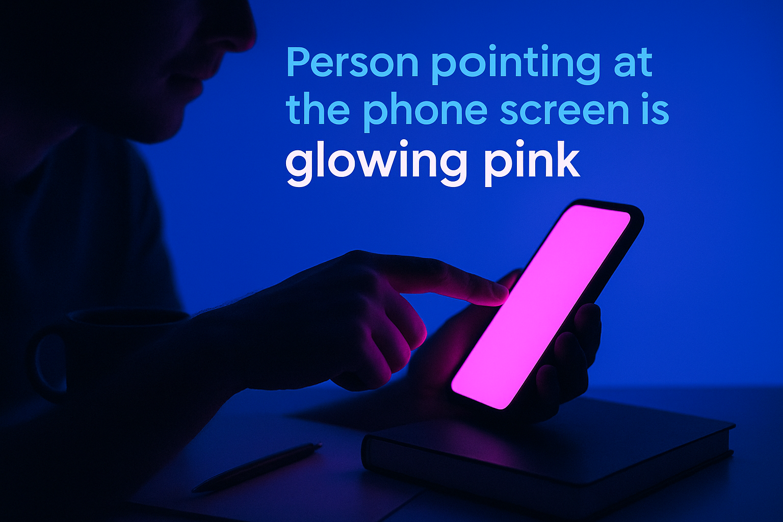 /Collection: /by davooda/Type: PNG/A person is pointing at a phone screen emitting a vibrant pink glow against a solid blue background. The scene combines neon hues with a cool, shadowy ambiance.