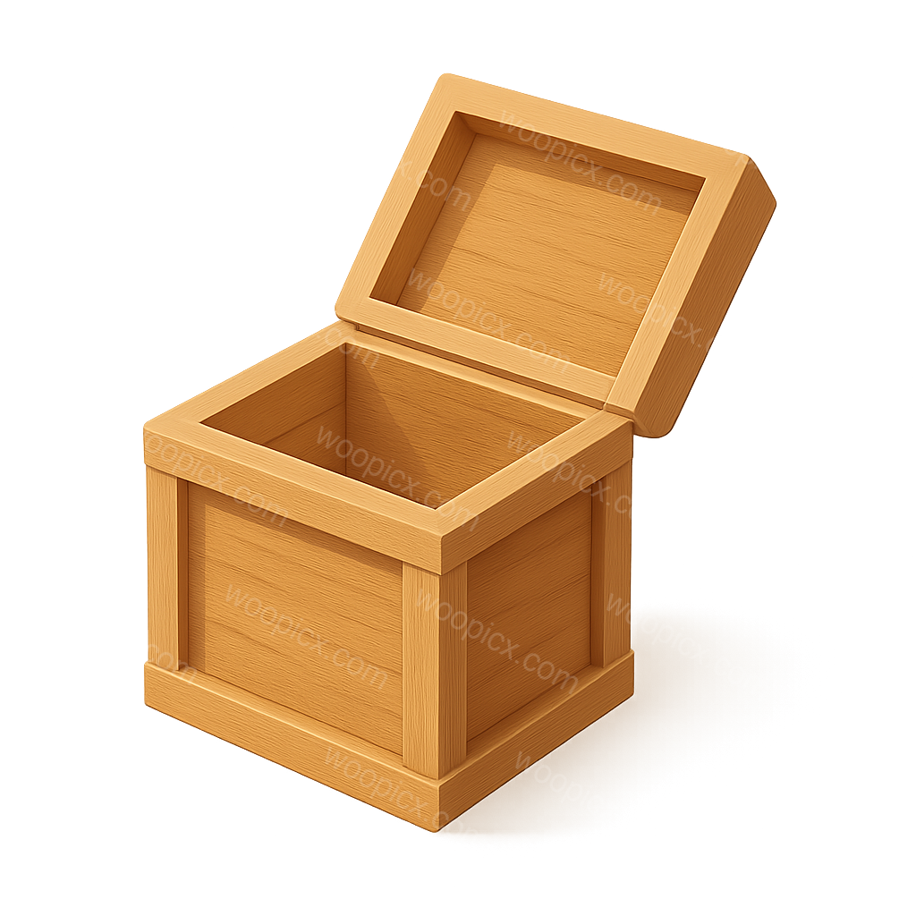 A 3D isometric illustration of a wooden tea chest with an open lid, showcasing its volumetric design and smooth textures on a transparent background.