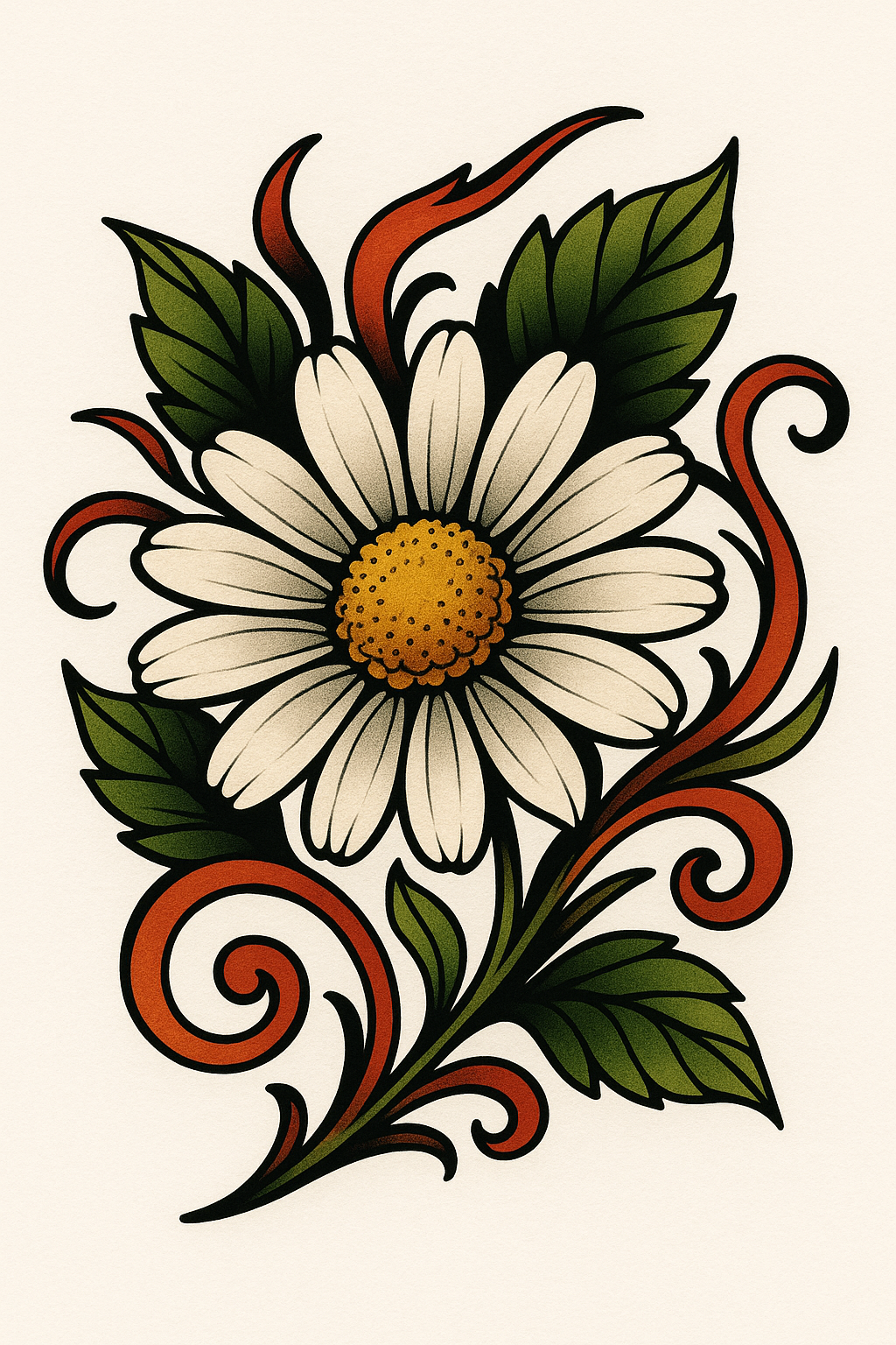 Vibrant floral artwork featuring a detailed daisy surrounded by stylized leaves and swirls, ideal for use in tattoo design or decorative prints.