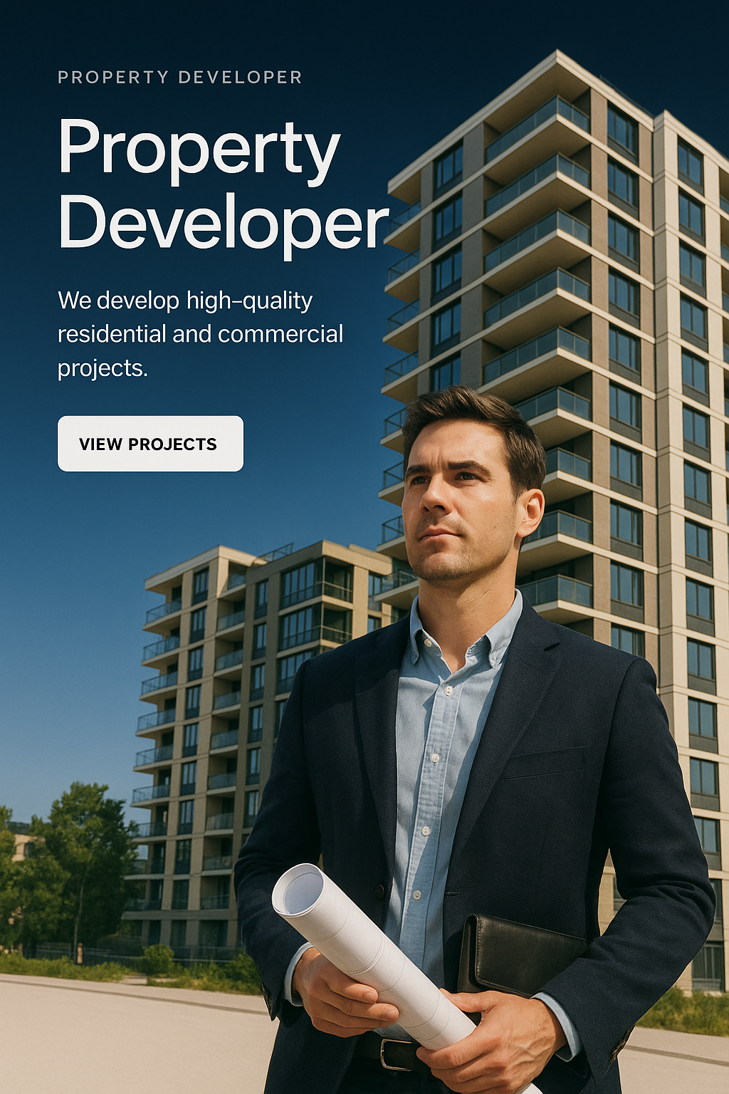 A sleek web page design for a property developer featuring a professional man holding blueprints, modern buildings in the background, and a clear call-to-action button.