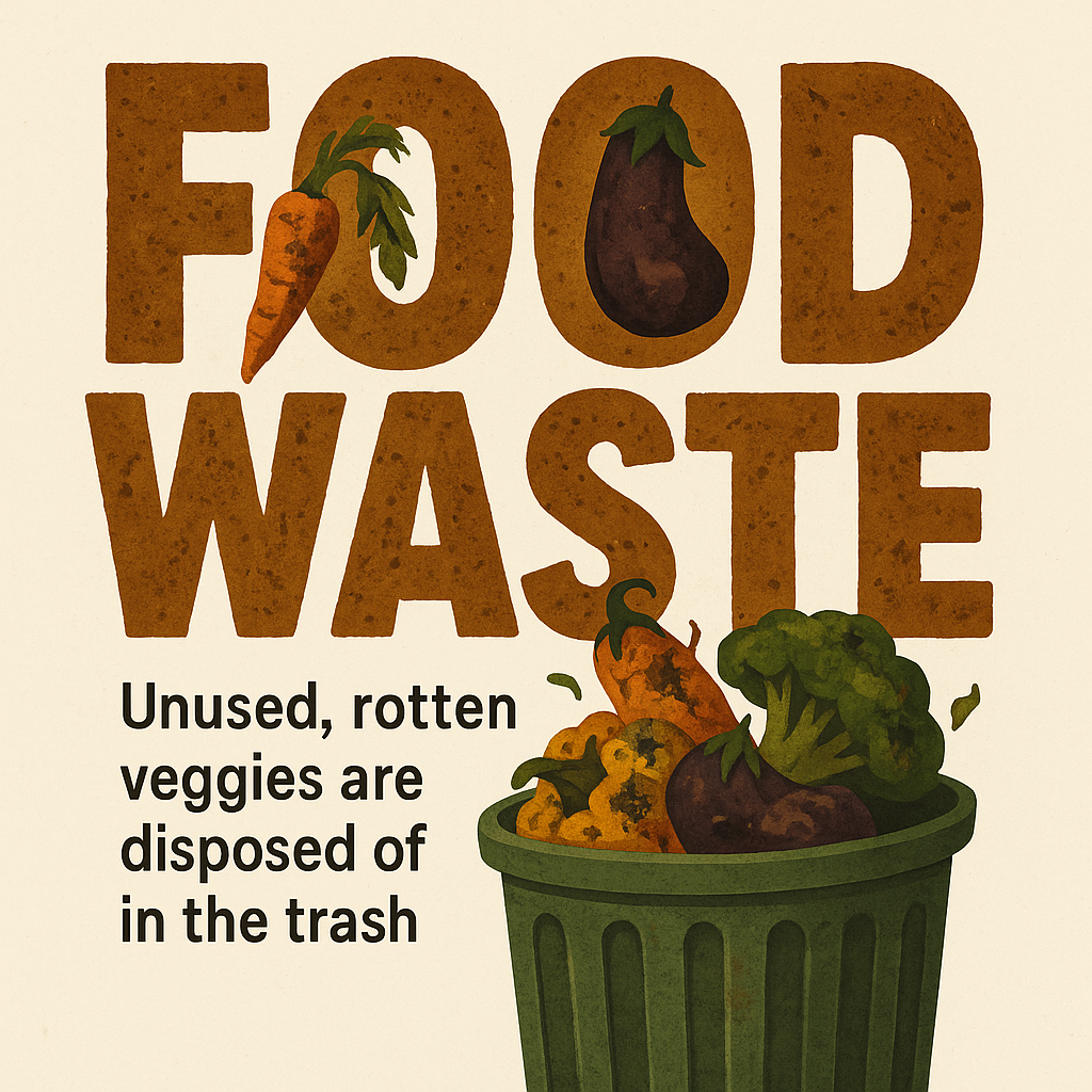 A visually engaging poster highlighting the issue of food waste, featuring a graphic of a trash bin filled with discarded vegetables. Ideal for educational campaigns on sustainability.
