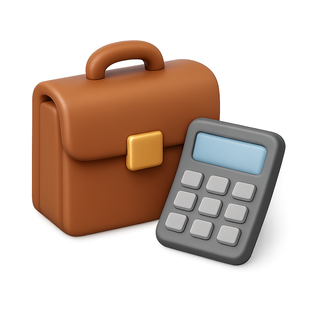 /Collection: /by davooda/Type: PNG/This image features a stylized 3D briefcase and calculator, designed with a three-quarter perspective. The briefcase is brown with a golden clasp, while the calculator is gray with a blue display, set against a gradient background.