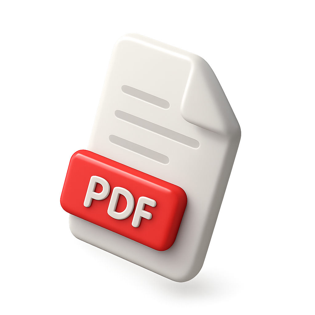 A visually striking 3D icon representing a PDF file, featuring a white document with a bold red button labeled 'PDF'. The icon is rendered in a three-quarter view with a transparent background.