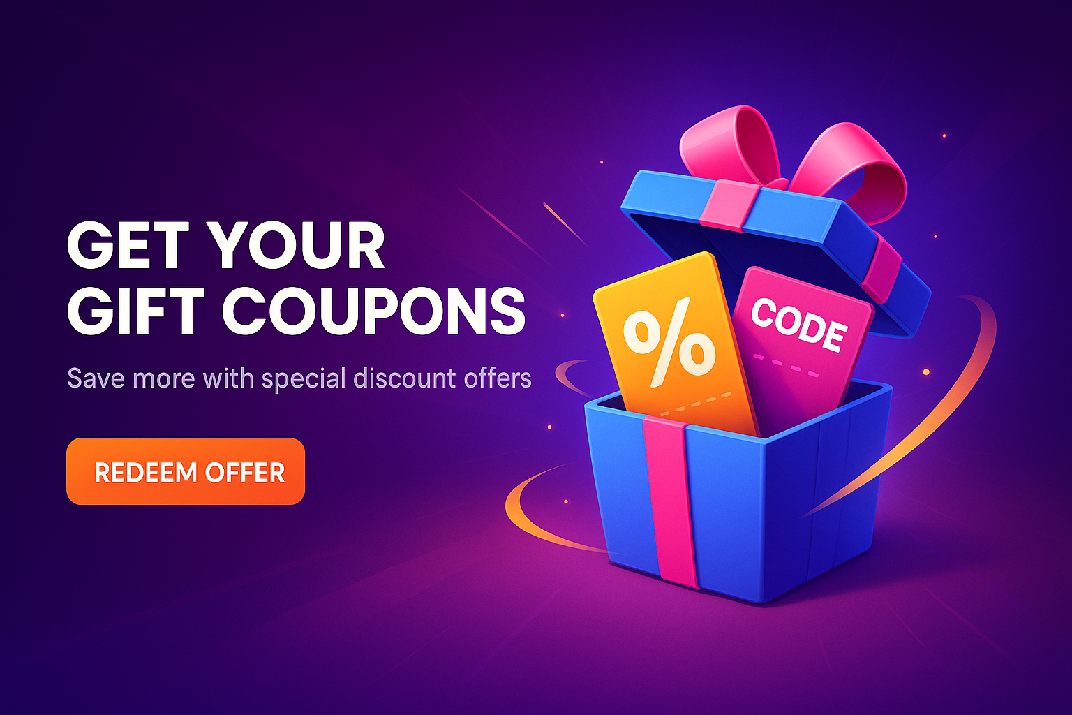 A vibrant 3D representation of a gift box revealing colorful coupons with discount codes, set against a dark purple background with a glowing effect.