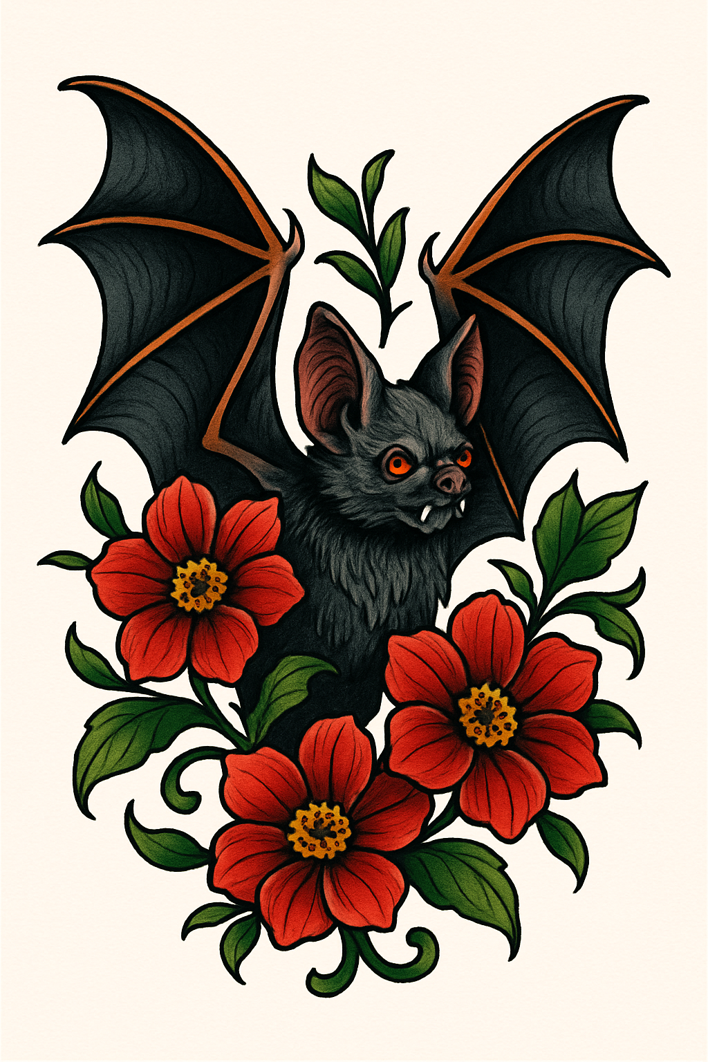 A striking illustration featuring a detailed bat with outstretched wings amidst bold red flowers, ideal for Halloween-themed designs or tattoo art.