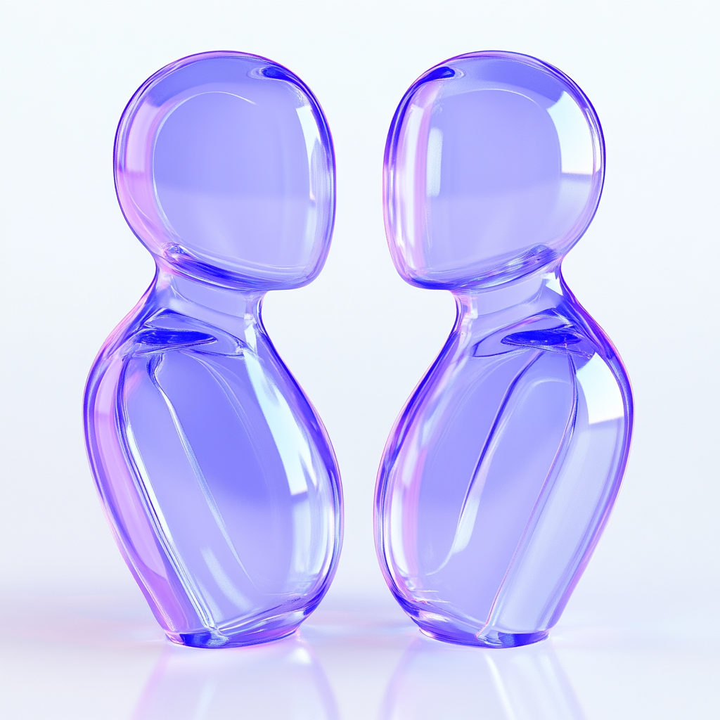 A modern artistic representation of two abstract figures in translucent purple glass, ideal for use in design projects or as a decorative element.
