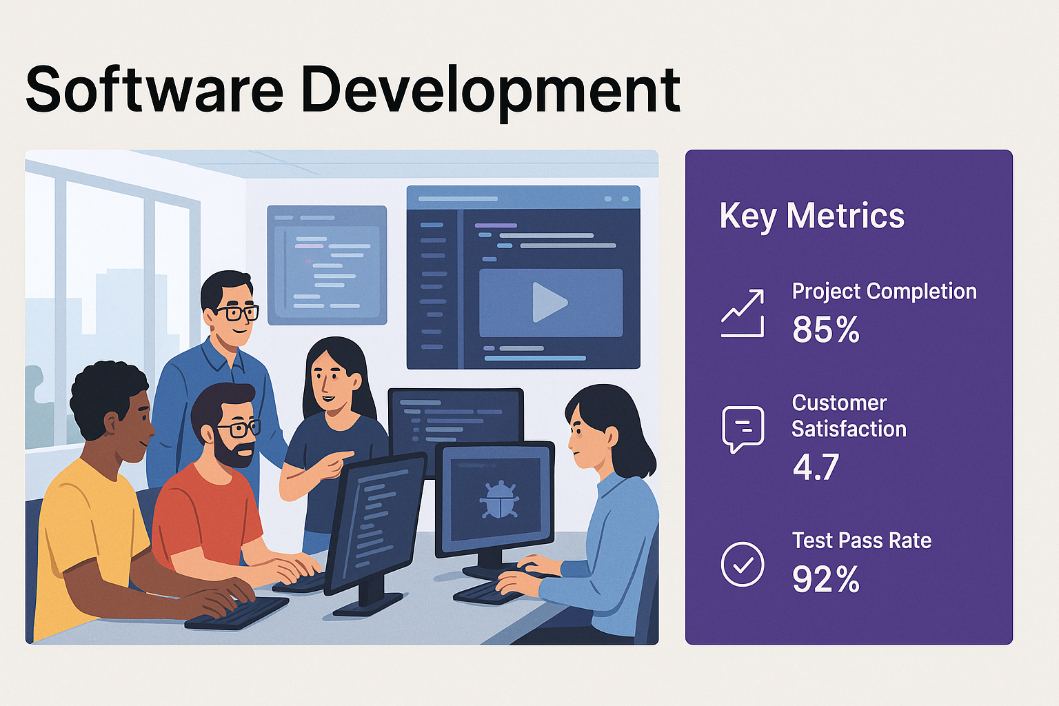 /Collection: /by davooda/Type: PNG/Informative infographic illustrating key software development metrics with a modern, illustrative design. Suitable for tech presentations and educational content.