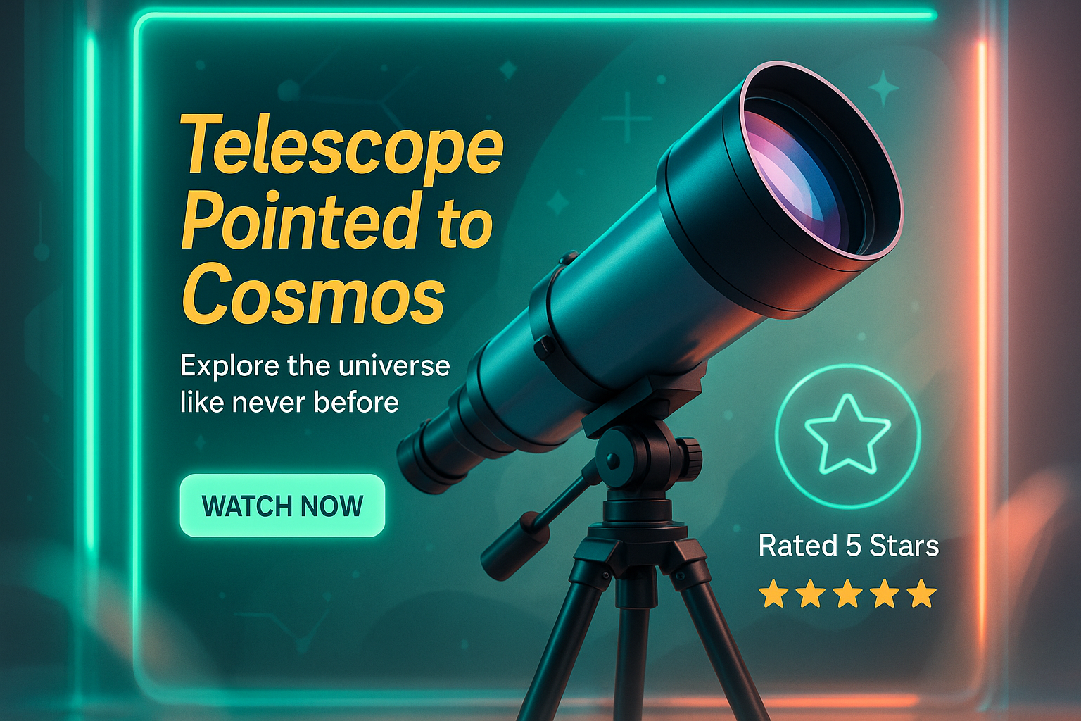 /Collection: /by davooda/Type: PNG/Vibrant promotional graphic showcasing a telescope with a cosmic background, designed to attract viewers to explore the universe. Ideal for astronomy enthusiasts and educational content.