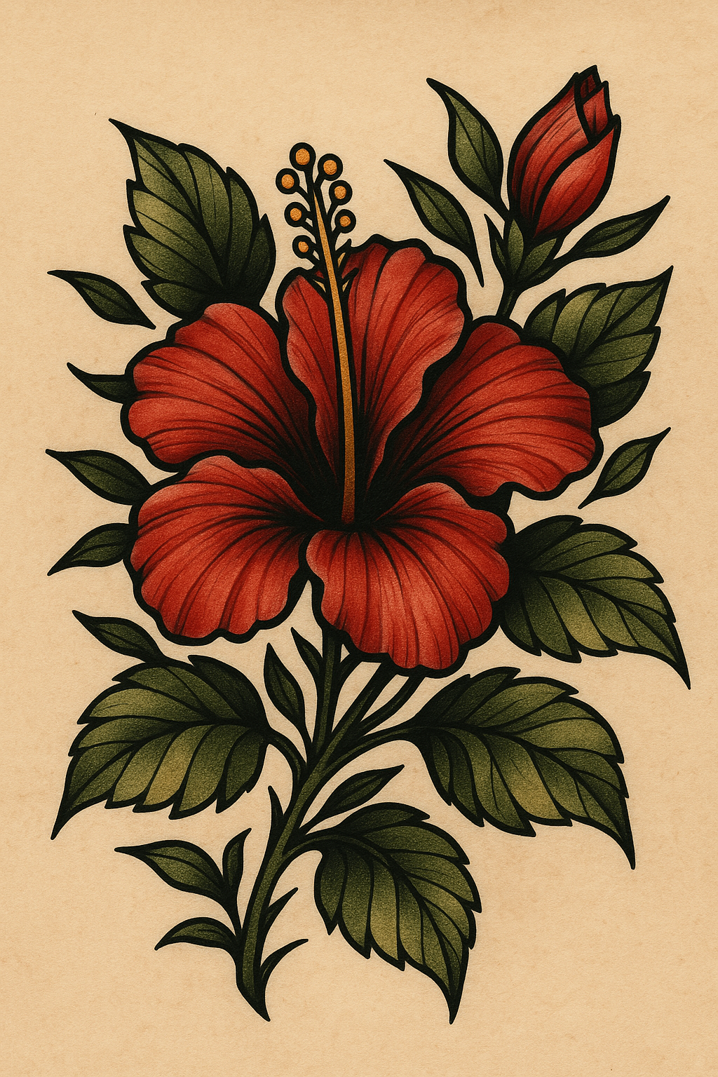 This image features a vibrant red hibiscus flower with lush green leaves, showcasing a bold illustrative style. It's suitable for art prints or botanical design use.
