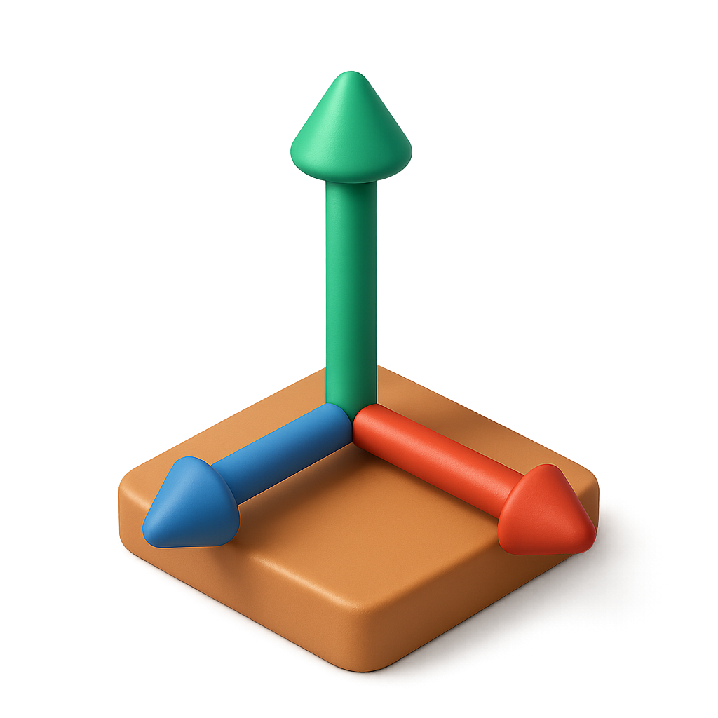 A visually striking 3D icon featuring three colorful arrows (green, blue, and red) extending from a brown isometric base, creating a dynamic axis representation.