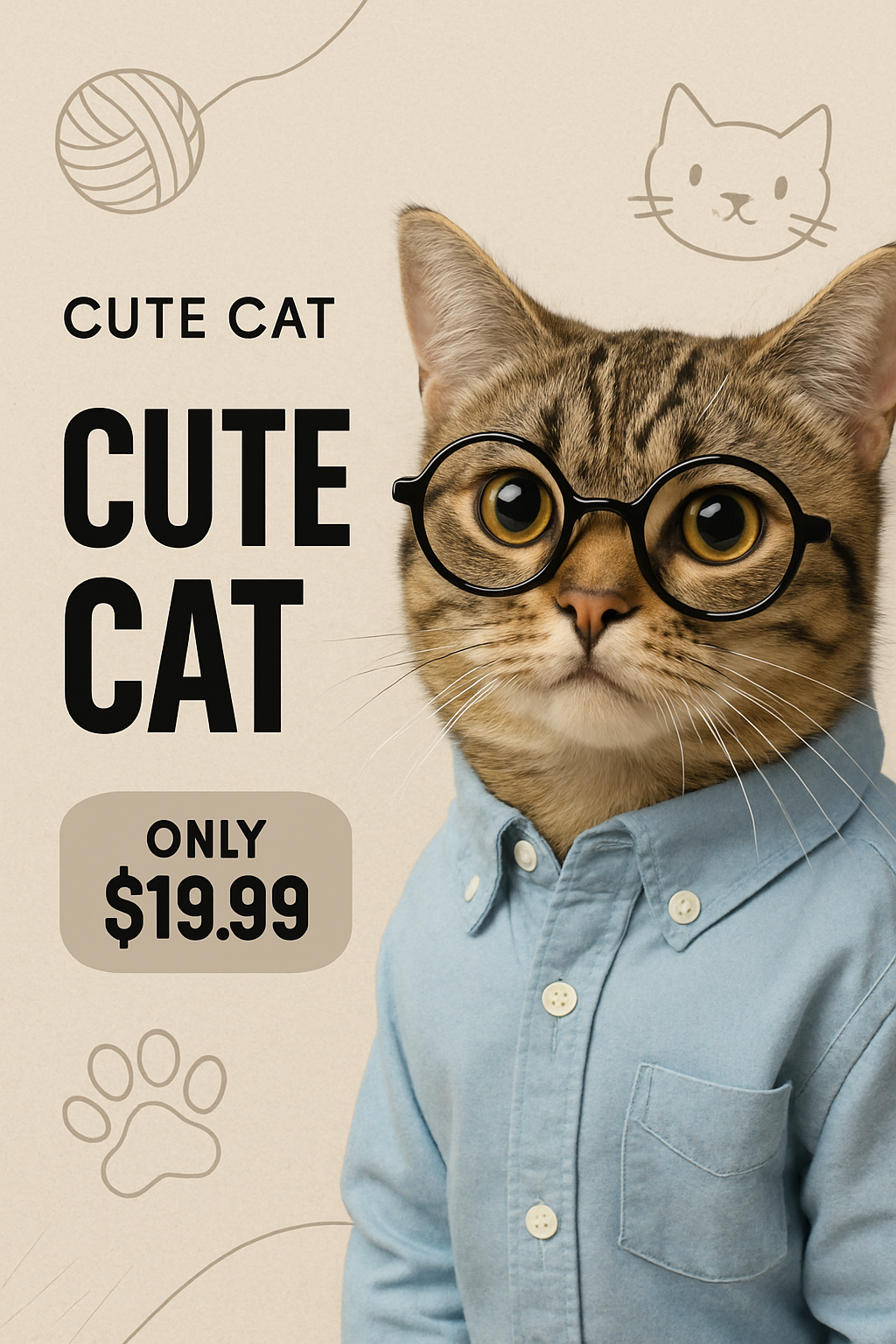 A charming cat wearing glasses and a button-up shirt stands against a textured light background, accompanied by playful illustrations and bold typography.
