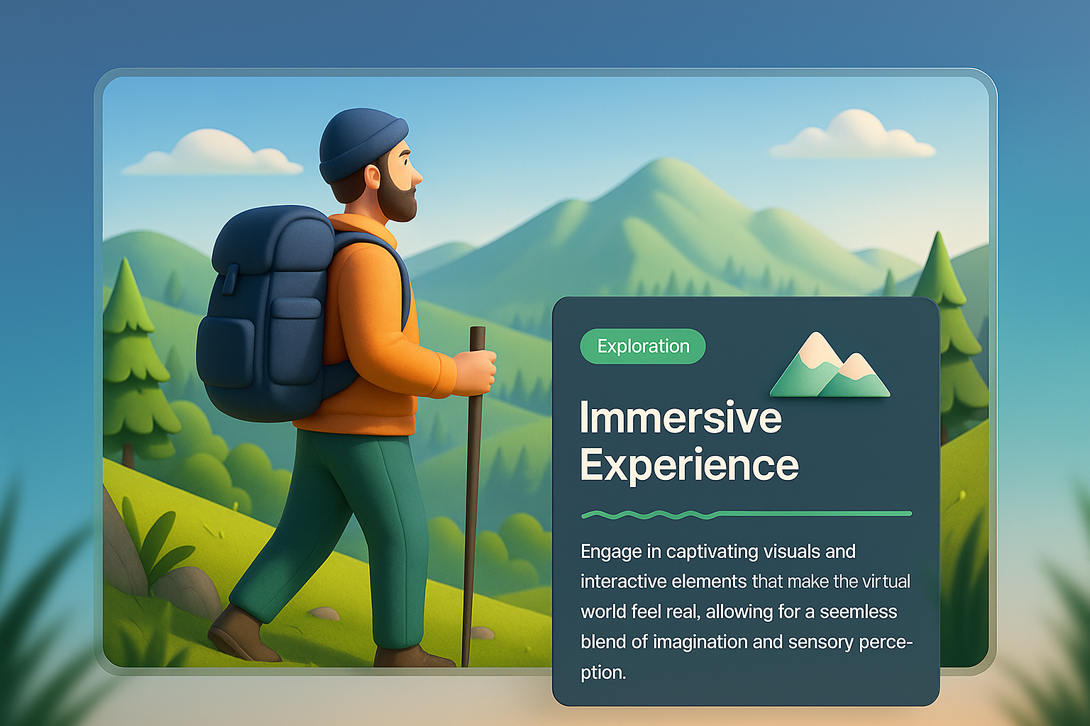 A 3D illustration of a hiker walking through a vibrant natural landscape, accompanied by a visually integrated information block detailing an immersive experience.