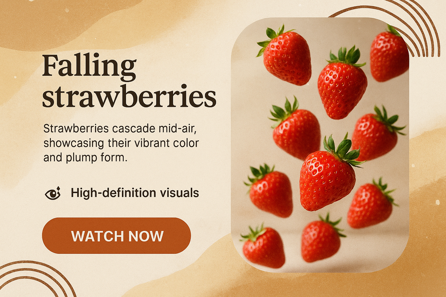 /Collection: /by davooda/Type: PNG/A captivating design featuring falling strawberries with vibrant colors against a smooth gradient background, complete with engaging text elements and a call-to-action button.
