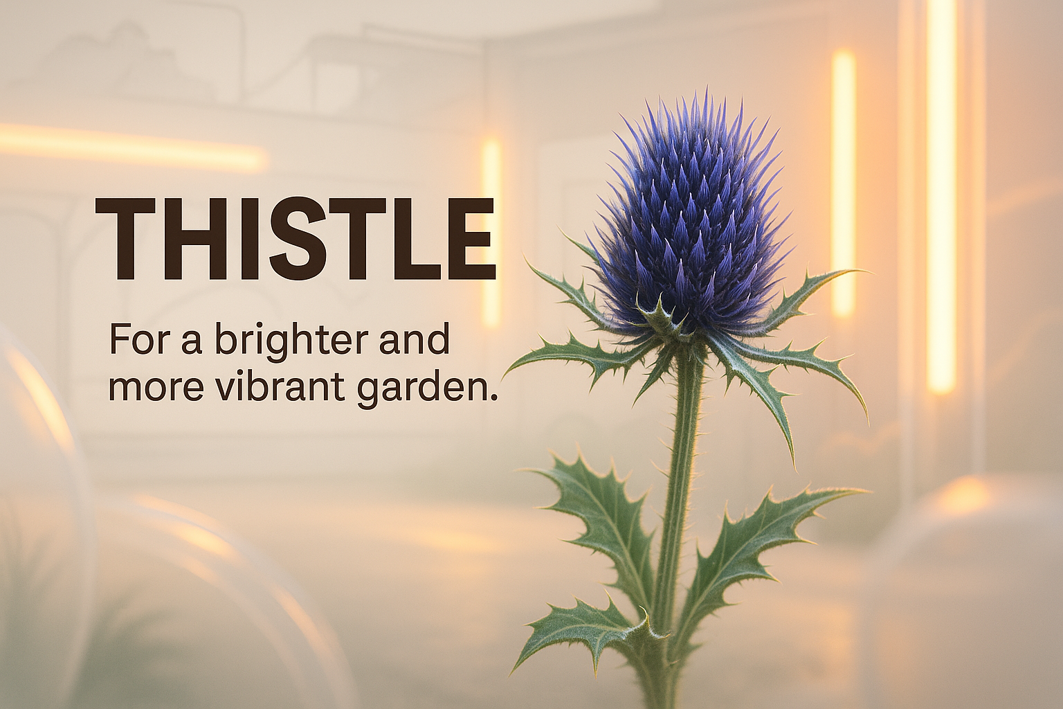 A visually striking image of a thistle plant accompanied by motivational text, designed for gardening enthusiasts and promotional materials.